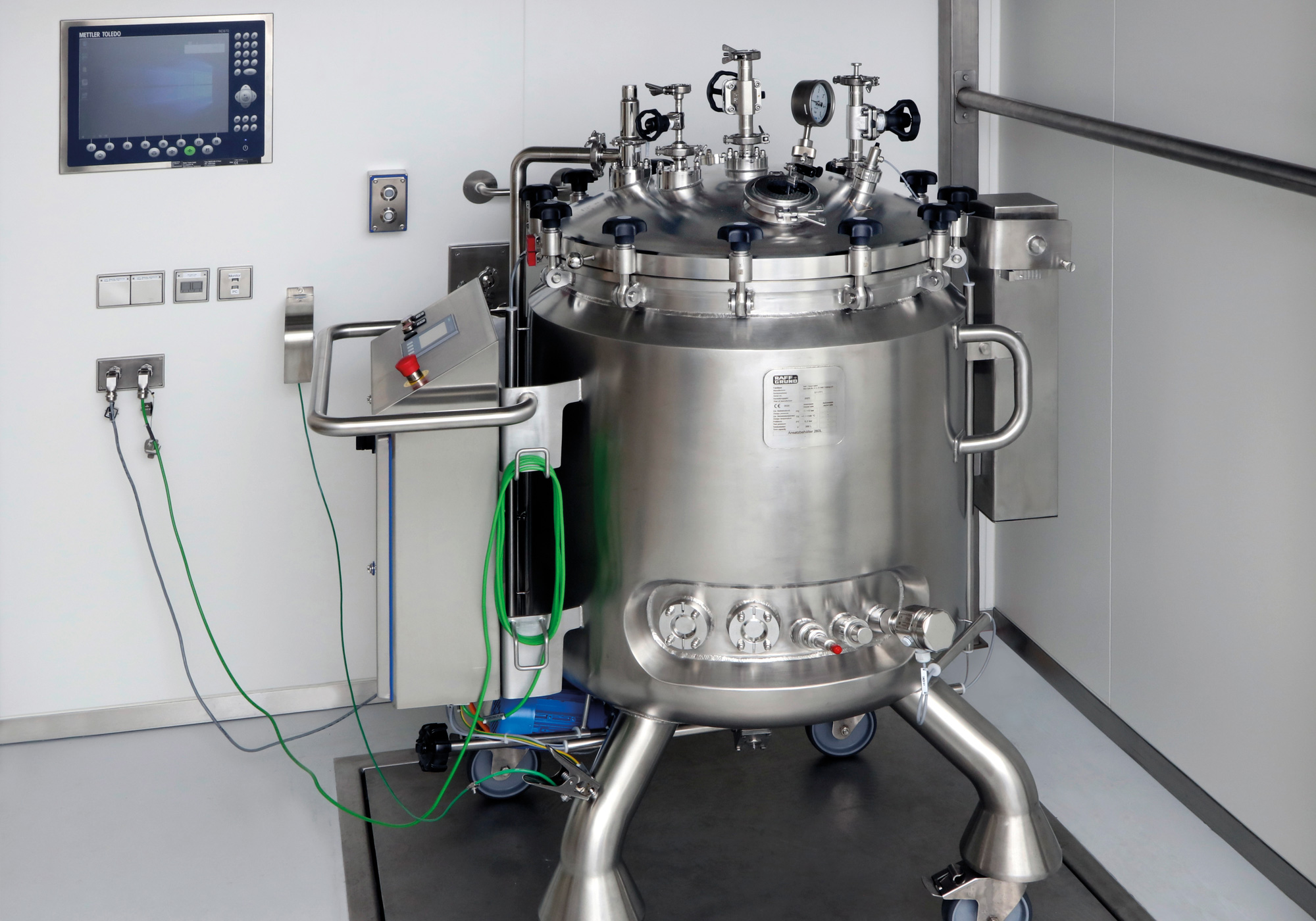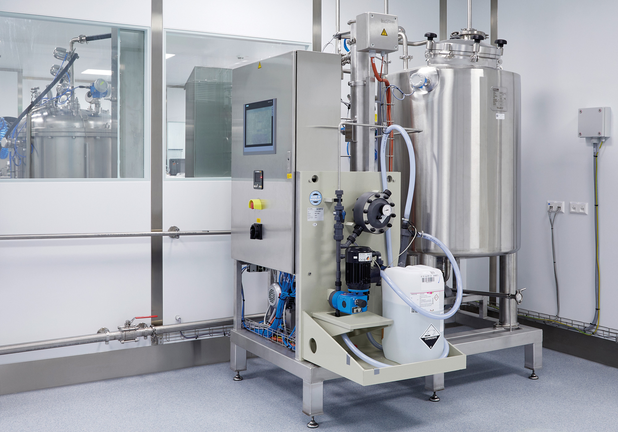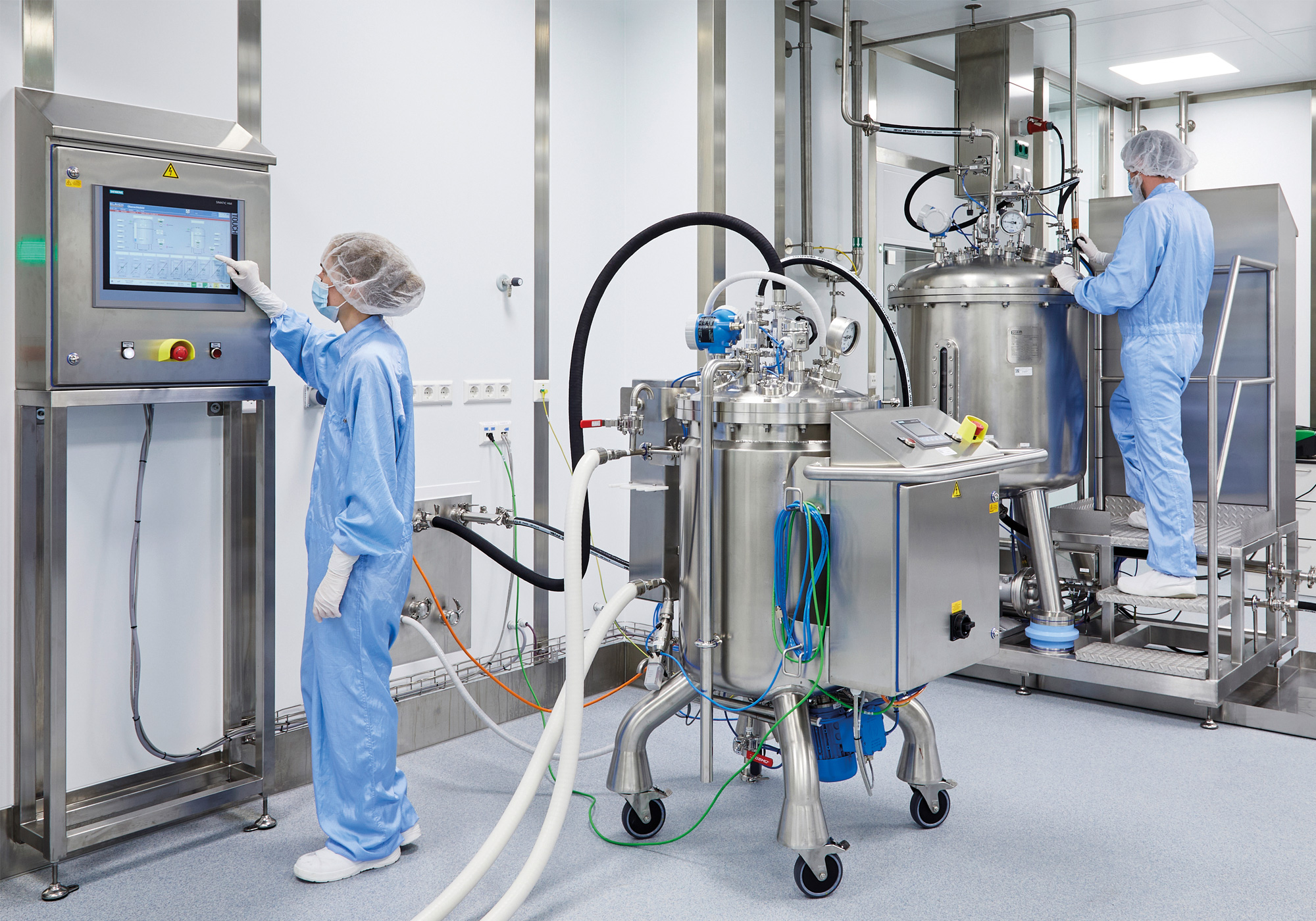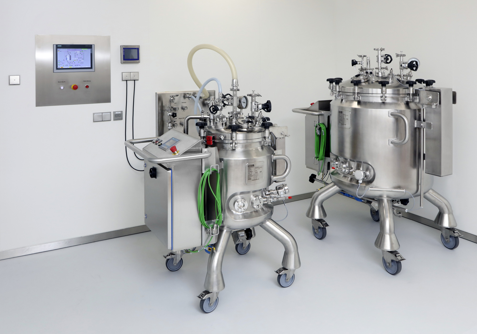 Die Mobilbehälter werden am Reinigungs- und Sterilisationsplatz oder an mehreren Rührplätzen über eine eigene IP-Adresse von der Automatisierung erkannt. Die Steuerung erfolgt über ein HMI im Reinraum und den Touchpanels an den Behältern oder über die Steuerung an der CIP-Anlage im Technikraum. Inkl. Konstruktion, Bau, Montage, Inbetriebnahme und Qualifizierung (DQ, IQ, OQ) der Anlage.