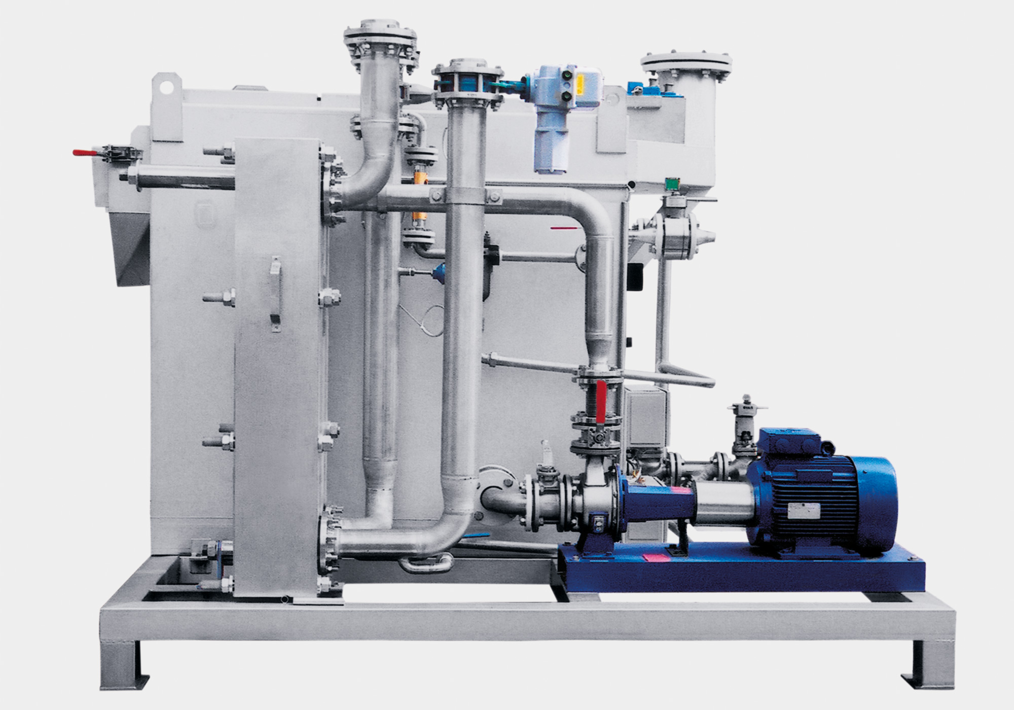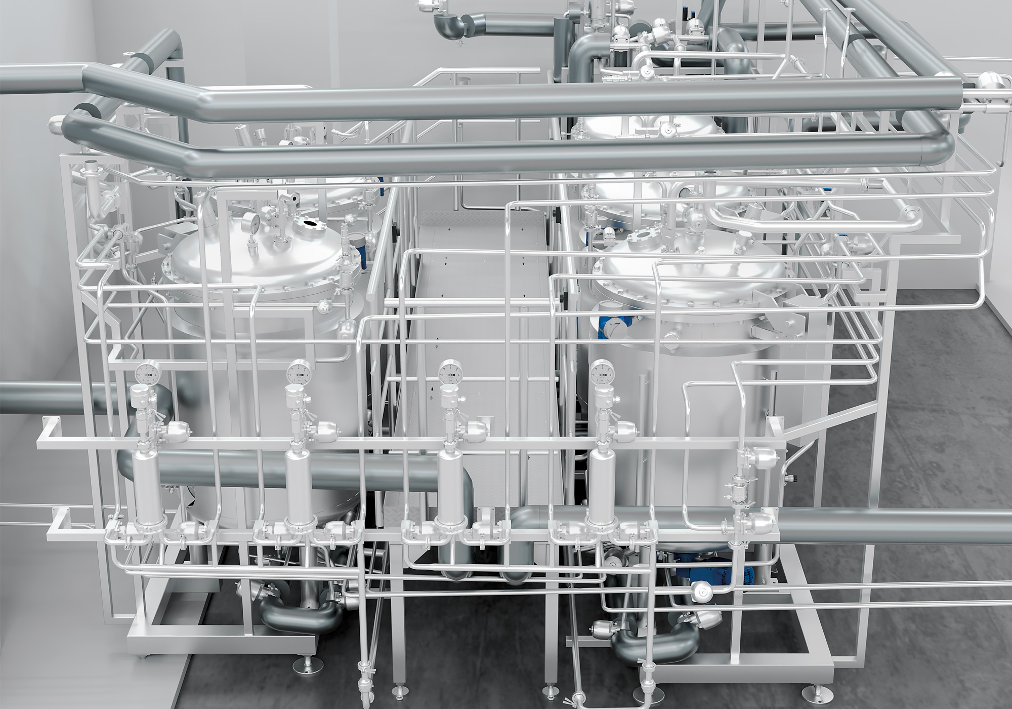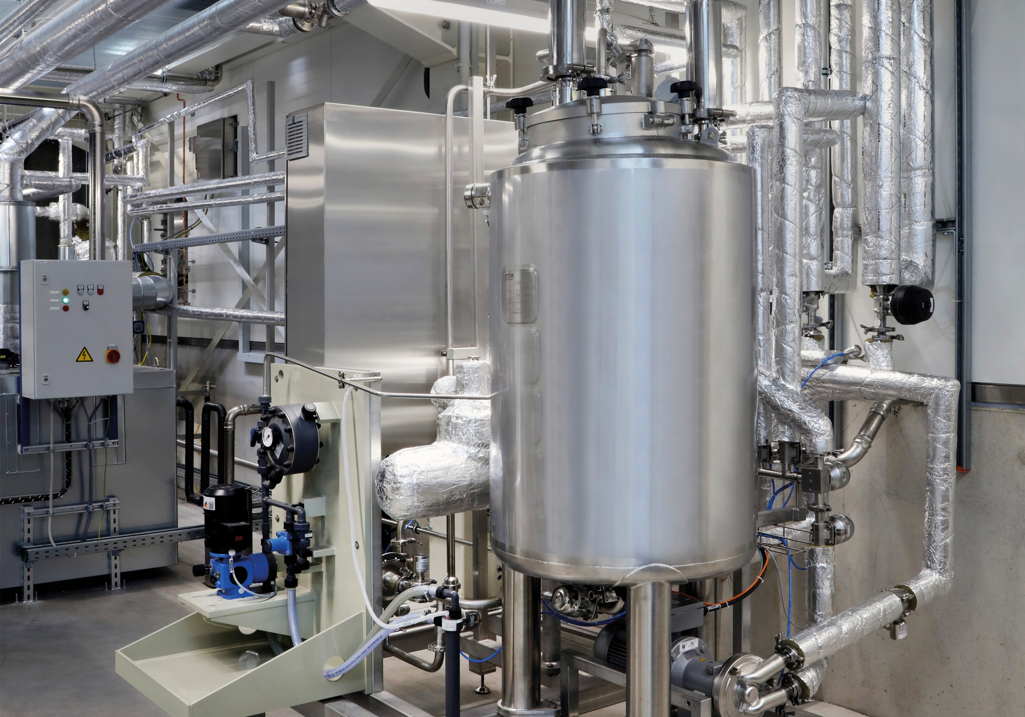 Besonderer Wert wurde auf die Reinigbarkeit der Anlage sowie der Produktrohrleitungen gelegt. Anlagenerstellung erfolgte unter Berücksichtigung der Druckgeräterichtline (DGRL), Maschinenrichtline (MRL) und ATEX-Richtlinie (ATEX). Inklusive Inbetriebnahme und Qualifizierung (DQ, IQ, OQ) der Anlage.