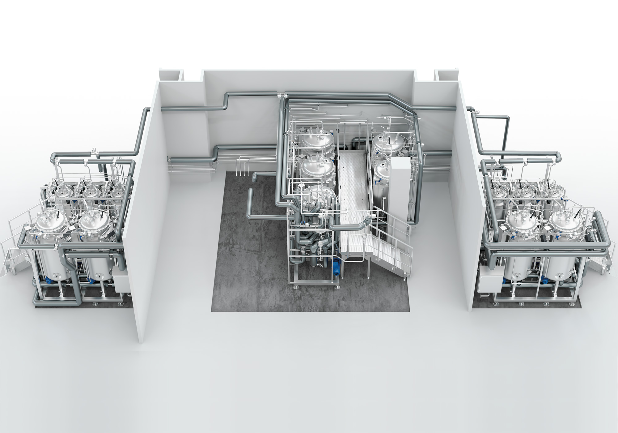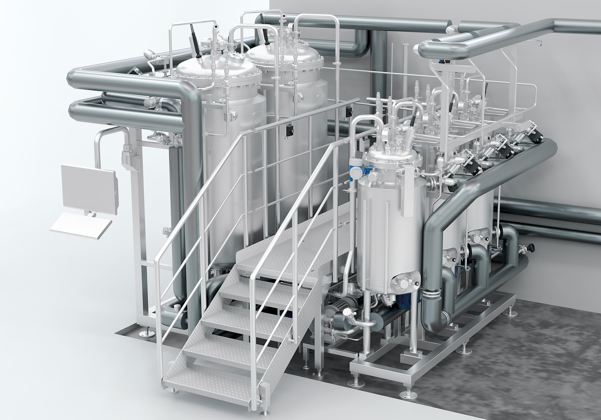 Auslegung und Erstellung einer Anlage zur sterilen Ansatzherstellung bestehend aus einer CIP-Anlage mit Zentralsteuerung, der Möglichkeit zur Reinigung und Sterilisation von diversen Mobilbehältern sowie mobile Ansatzbehälter.