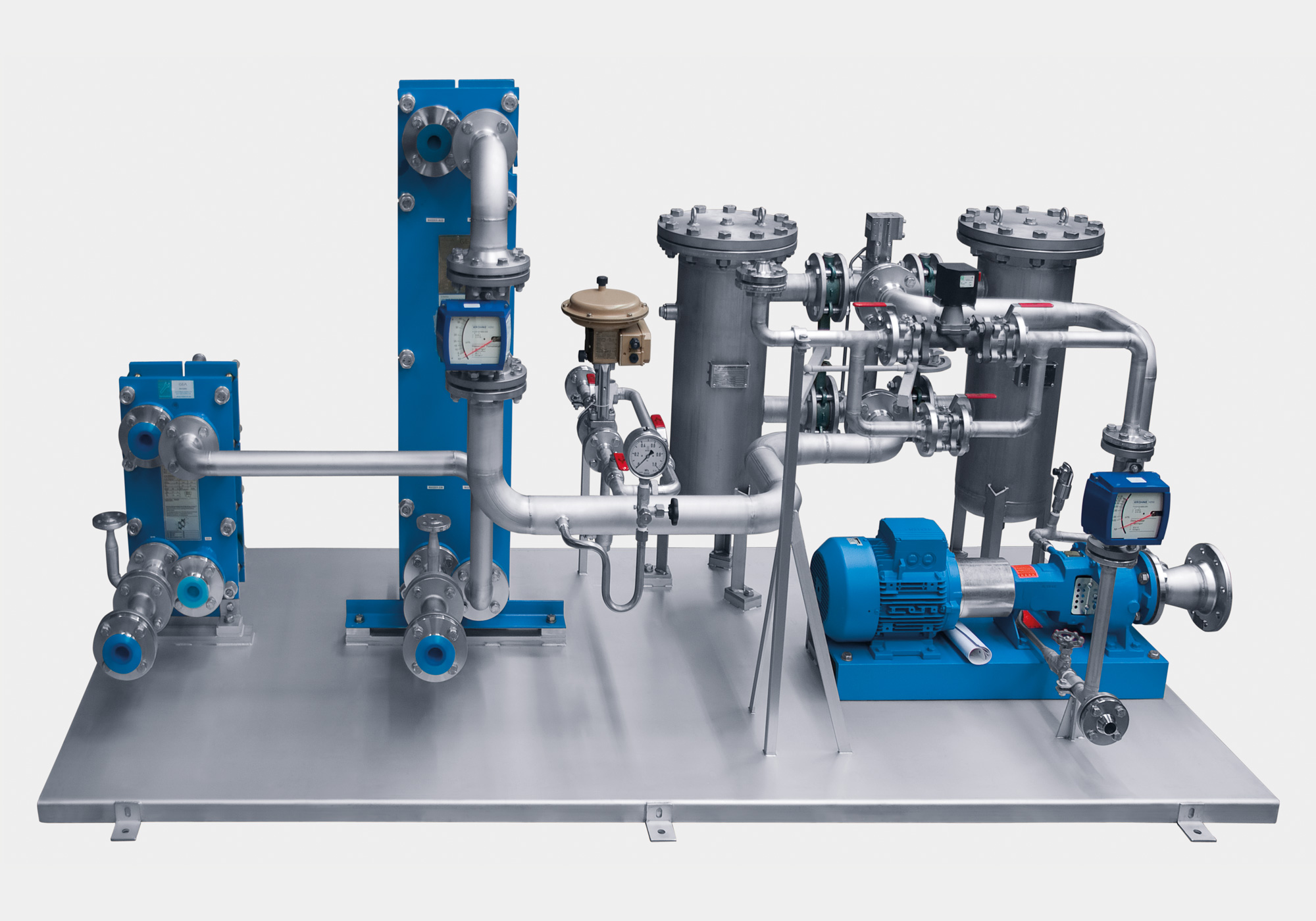 Konzeption, Konstruktion und Bau einer Kühlwassereinheit bestehend aus 2 Plattenwärmetauscher, 1 Doppelfilter und einer Pumpe inkl. Verrohrung.